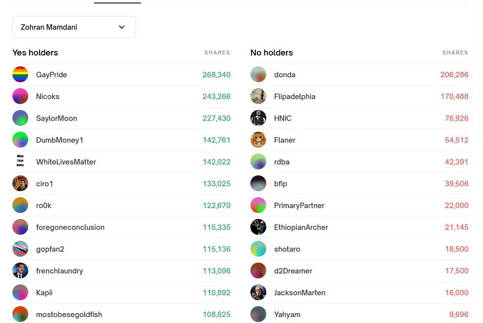 Backing Mamdani is GayPride, another high-profile trader with a strong track record in electoral markets. With 268,000 YES shares, he’s leading the charge alongside names like Nicoks, SaylorMoon, and WhiteLivesMatter, all of whom have placed major positions on Mamdani’s side.
