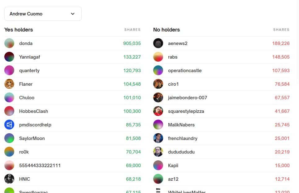 On the Cuomo side, donda has taken a legendary position, accumulating over 900,000 YES shares, a position worth hundreds of thousands of dollars. His confidence in Cuomo hasn’t wavered, even as the market turned sharply against him. It’s one of the largest single bets in recent Polymarket history.