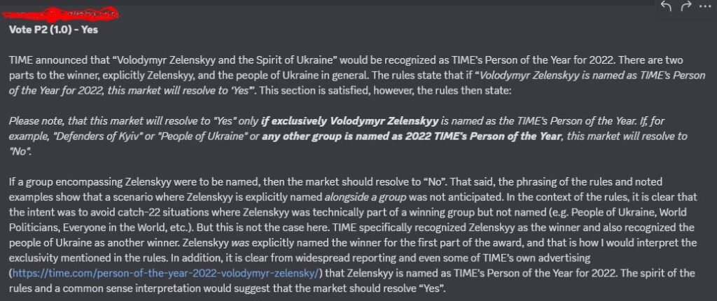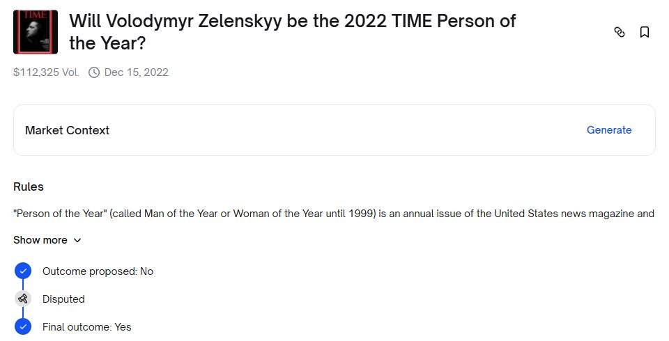 The “Will Volodymyr Zelenskyy be the 2022 TIME Person of the Year?” market remains one of the most important disputes in Polymarket’s short history. It tested the limits of natural language in prediction markets, the effectiveness of decentralized oracle systems, and the community’s ability to make nuanced judgments about market intent.
