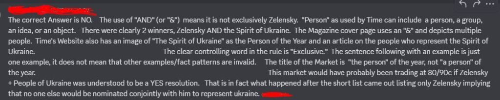 Initially, the market was proposed to resolve to NO, but this decision was immediately disputed, generating a heated discussion particularly about the exclusivity of the title. The central problem was whether Zelenskyy was the sole nominee or not.