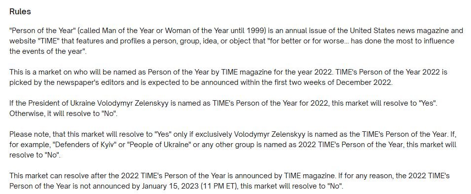 The rules stated that if “Volodymyr Zelenskyy is named as TIME’s Person of the Year for 2022, this market will resolve to ‘Yes’”. This section is satisfied. However, the rules then state that the market will resolve to “Yes” only if exclusively Volodymyr Zelenskyy is named.
